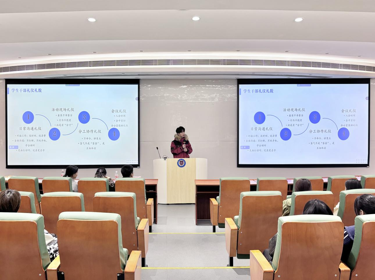 大会开始,轮值主席冯缘围绕《学生干部礼仪礼貌及演讲基本技巧》展开讲解,从日常工作中的沟通规范到公开演讲的注意事项,为学生干部的形象塑造与表达能力提供实用指导