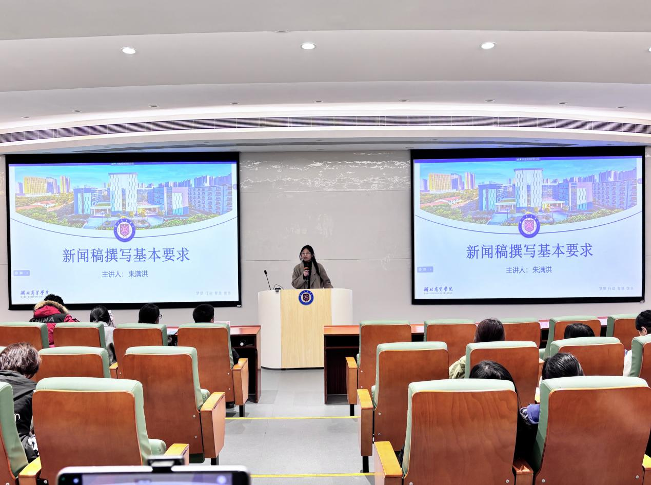 大会最后,轮值主席朱满洪则针对《新闻稿撰写的基本要求》展开培训,从新闻基本框架、新闻语言风格等维度来规范新闻稿的撰写,提升学生干部的语言能力。