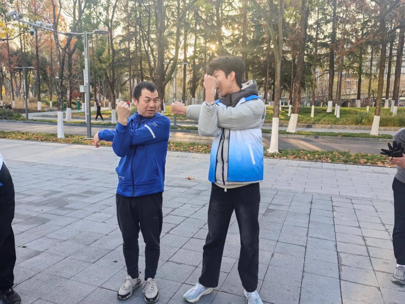 活动伊始,志愿队队员们与盲人跑友两两结对,开启了热身环节。在公园的开阔广场上,队员们耐心地引导盲人跑友做着拉伸动作,从手臂伸展、肩部环绕到腿部深蹲、腰部扭转,每一个动作都细致示范、逐一纠正。有的队员轻扶着盲人跑友的手臂调整姿势,有的则用清晰的语言描述动作要领,确保他们在热身过程中既活动开身体,又能感受到十足的安全感。暖阳下,志愿者与盲人跑友相互配合的身影,成为后襄河公园一道动人的风景线。
