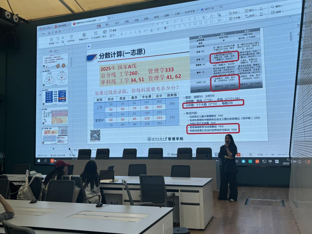 宣讲会现场气氛热烈,夏会会老师首先对到场学子表示热烈欢迎,并系统介绍了武汉纺织大学及管理学院的办学历史、学科特色、师资力量、科研平台和人才培养成果。她着重解读了2026年研究生招生的最新政策、专业目录、培养特色、考试大纲及复习建议,并对奖助贷勤体系等学生关切的问题作了详细说明。通过往届生的成功案例,夏老师生动展现了学院研究生教育的资源优势和发展前景。
