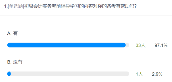 2022年春季学期还面向全校学生开了《初级会计实务考前辅导》、《经济法基础考前辅导》等公选课,为学生提供考前重点知识串讲及难点知识答疑。该公选课结课时面向班级做了一次问卷调查,97.1%的同学认为考前辅导是对备考有帮助的。