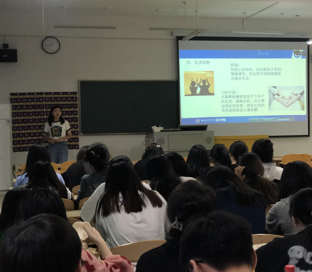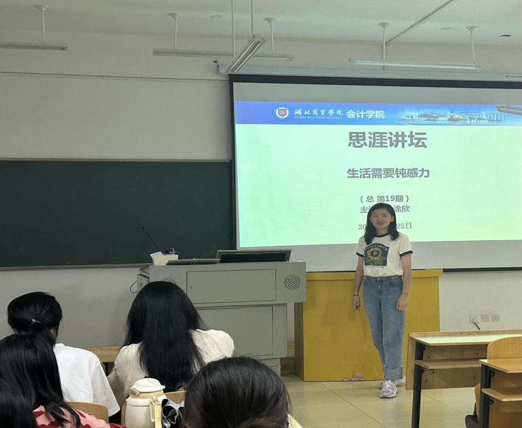 2023年5月25日晚上18点30分,湖北商贸学院会计学院教师涂欣在咸宁校区XJB109教室举办主题为“生活需要钝感力”的主题讲座,会计学院21级会计专业1、2班同学参加。