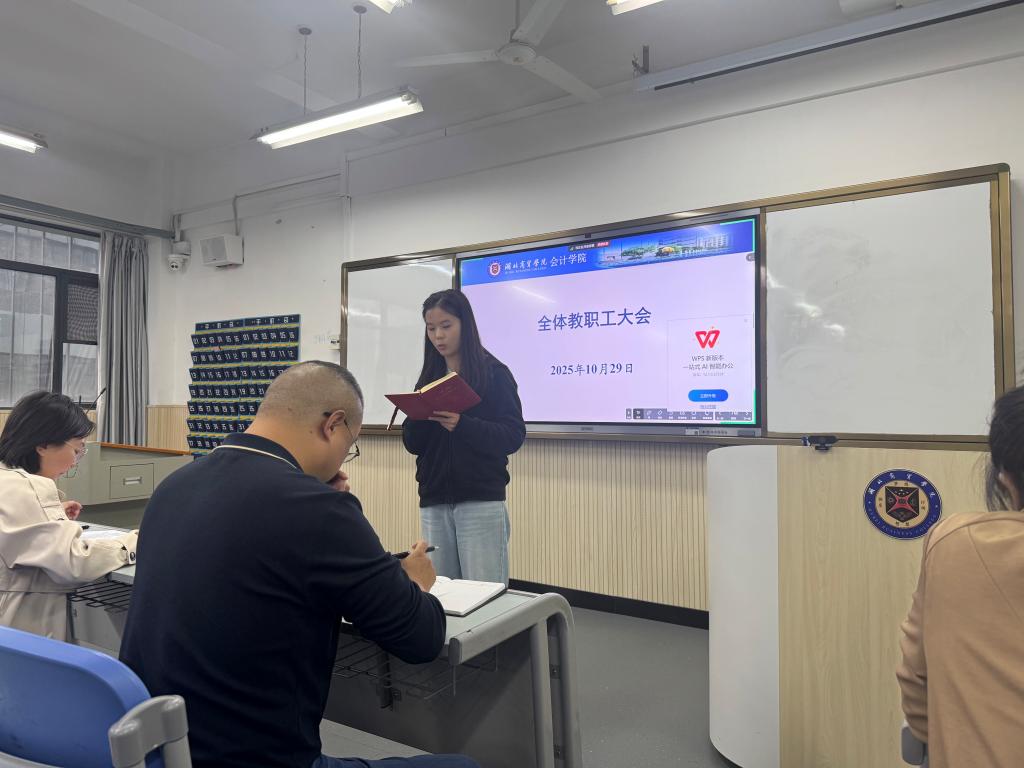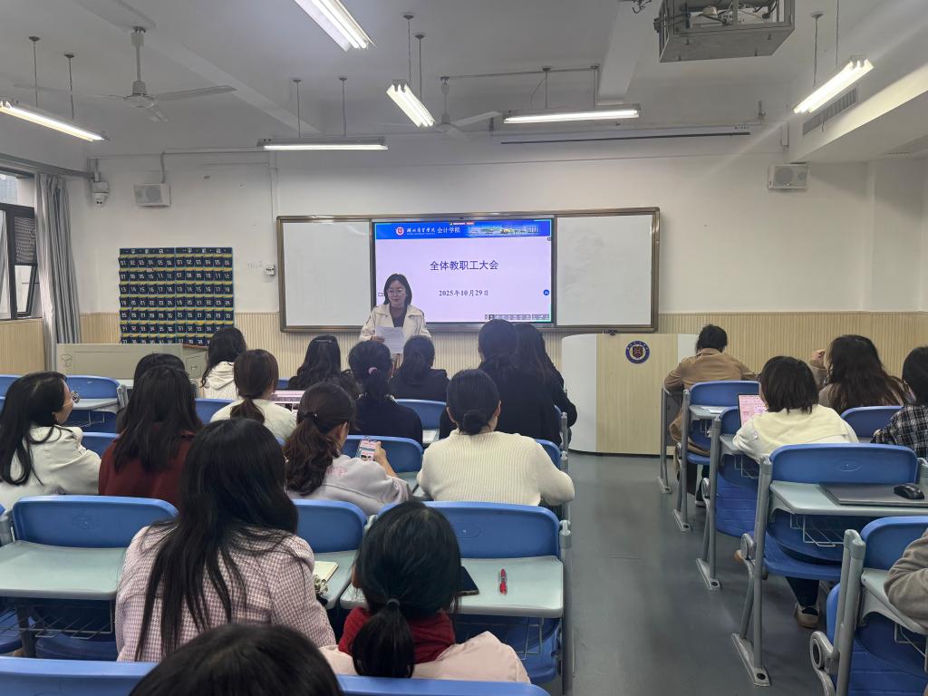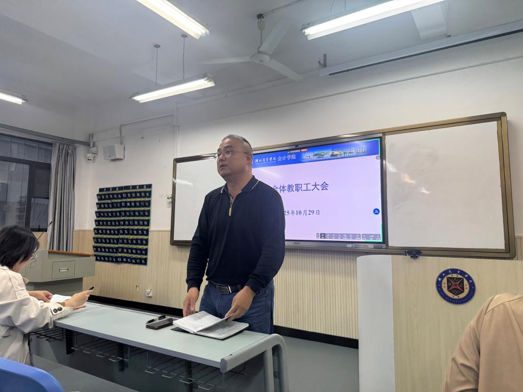 10月29日17时,会计学院在综合楼B502召开全体教职工会议。院长郑晓燕、党总支书记詹卓出席并讲话,全体无课专任教师、辅导员参会,咸宁校区同步线上参会。