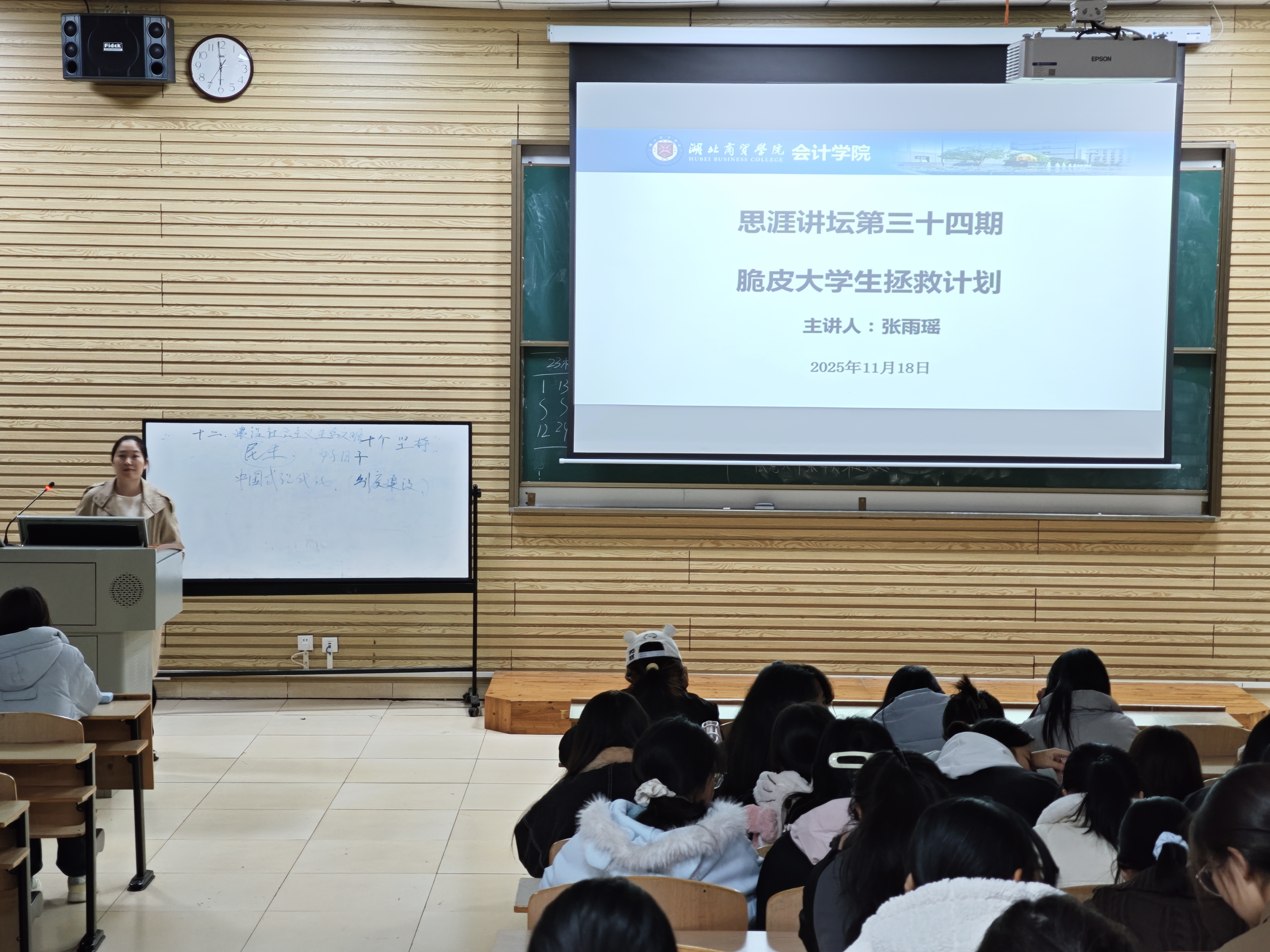 为切实关注大学生心理健康状况,帮助学生缓解心理压力,提升心理调适能力,远离“脆皮”状态。11月18日,张雨瑶老师于湖北商贸学院咸宁校区XJB-009教室举办了“脆皮大学生拯救计划”心理健康教育讲座,会计学院学生共同开启一场心灵成长之旅。