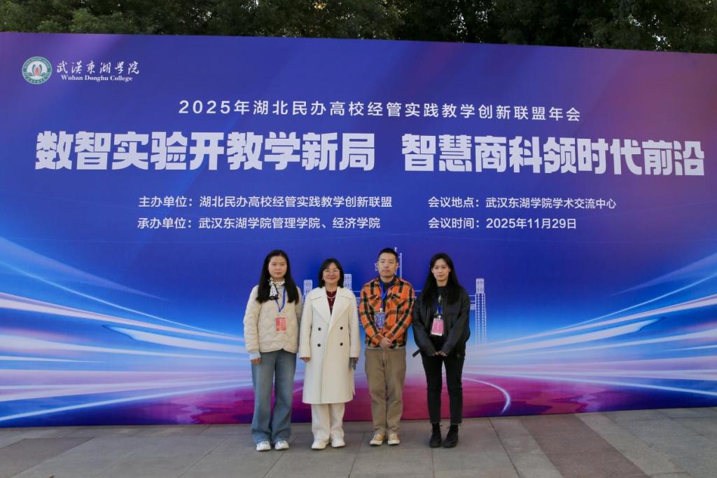 为深入落实国家教育数智化战略行动,积极探索会计学科数智化实践教学改革路径,11月29日,以 “数智实验开教学新局 智慧商科领时代前沿” 为主题的2025年湖北民办高校经管实践教学创新联盟年会在武汉东湖学院隆重召开。湖北商贸学院会计学院院长郑晓燕、副院长宋斌、数智化会计教研室主任葛瑞霞及教学秘书盛英组成代表团参会,与来自全省17所民办高校及企业单位的80余名代表共话经管实践教学数智化发展新方向。